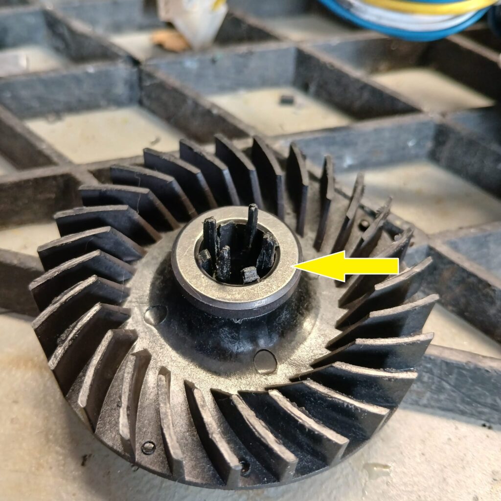 Deze Blaupunkt robotstofzuiger werd binnengebracht in verband met een niet meer draaiende midden borstel. Na demontage bleek de aandrijving van deze borstel stuk, de borging van het kunststof aandrijfwieltje op het asje bleek defect.