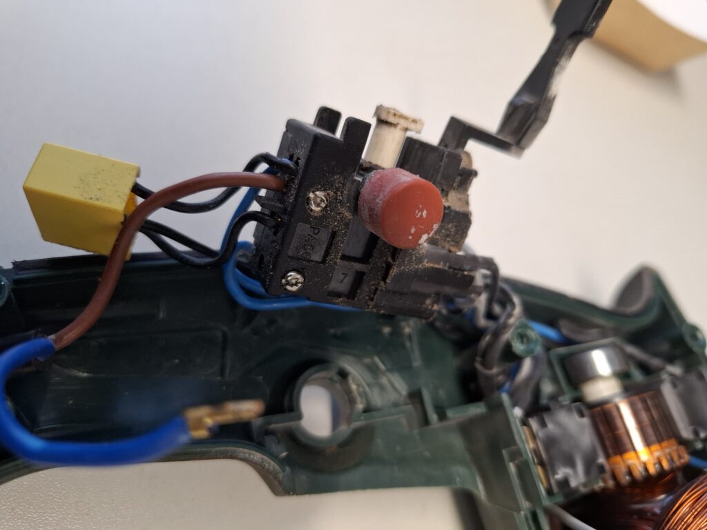 Deze boormachiene werd aangeboden met een afgebroken bedieningsknop. Overwogen werd om deze te lijmen maar dat zou waarschijnlijk geen duurzame verbinding opleveren.