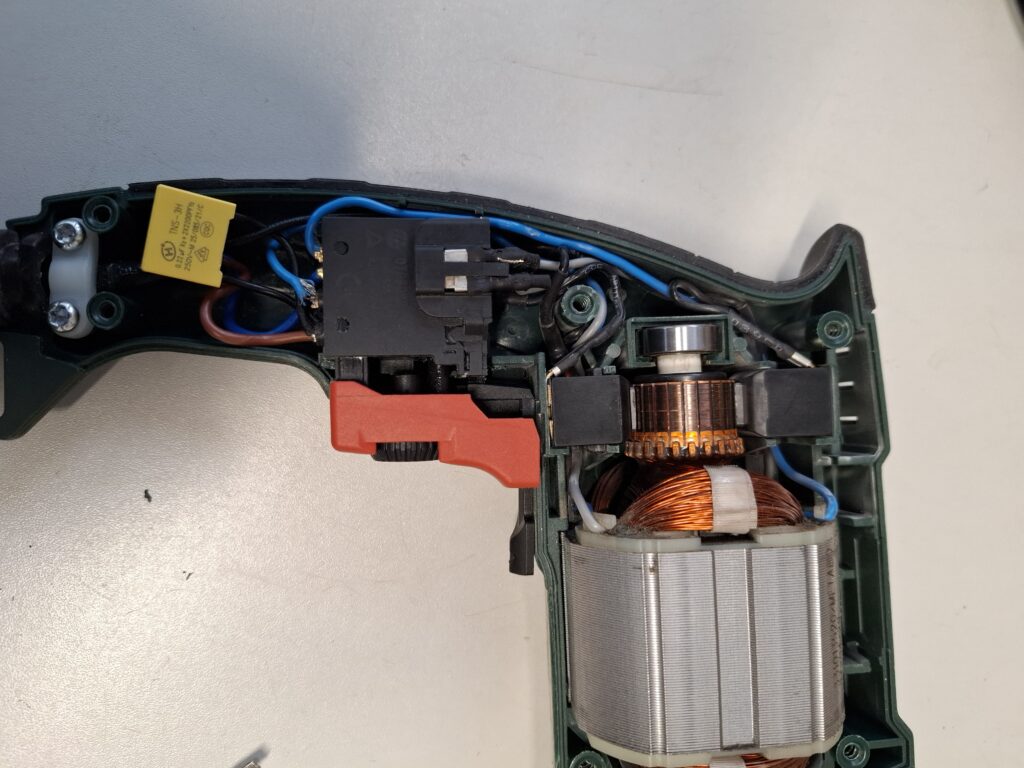 Deze Dremel werd aangeboden met de klacht dat hij niets meer deed. De monteur heeft het apparaat uiteengenomen en constateerde dat er een breuk in de stator zat. Deze zat gelukkig helemaal aan het begin en door inkorten van de draad kon de breuk worden hersteld.